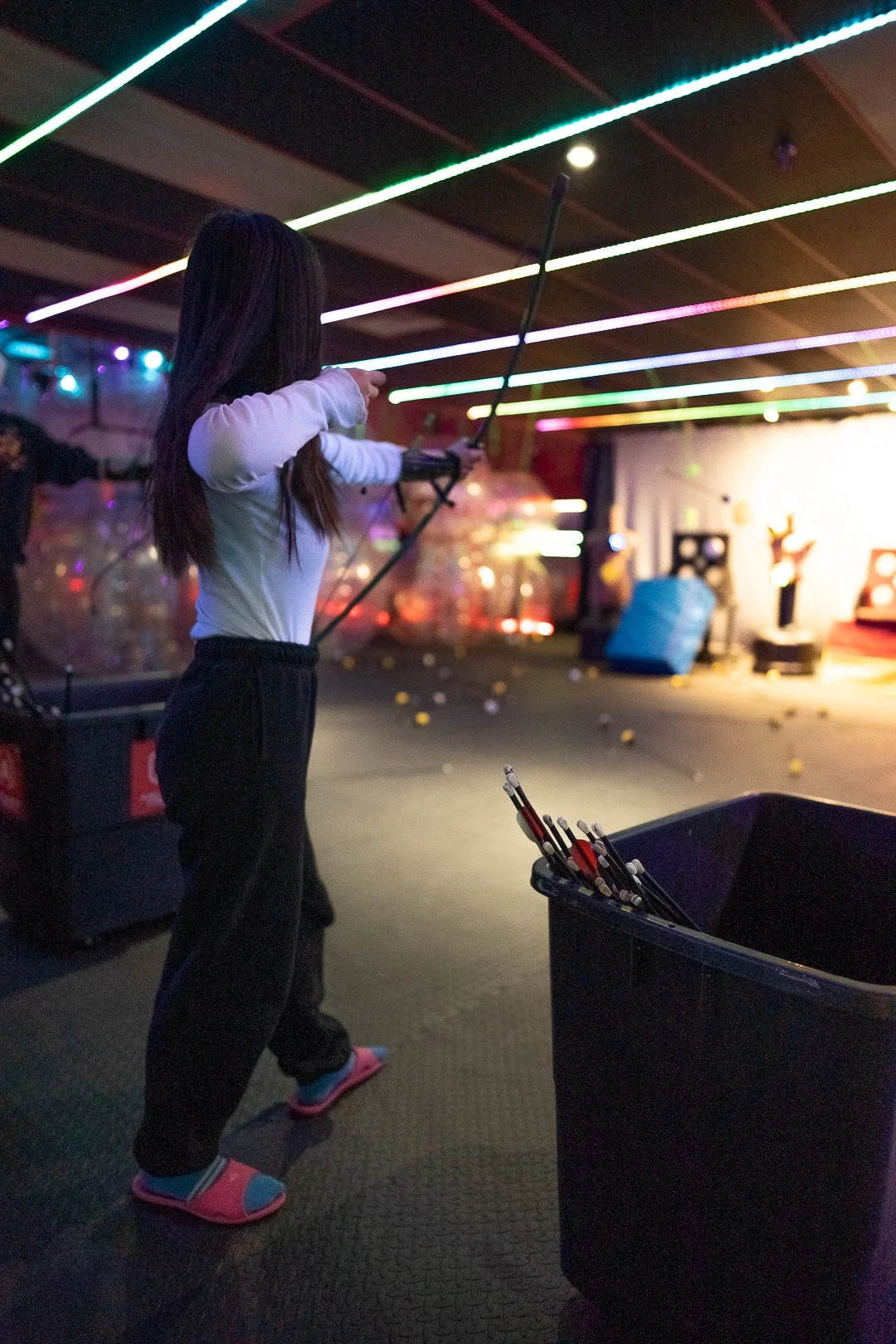 It all starts with our signature combat archery, where dodgeball intensity meets bow-and-arrow precision. This isn’t just a casual shoot-around, this is full-speed, team-based action with foam-tipped arrows, bunkers, music blasting, and your crew fully locked in.